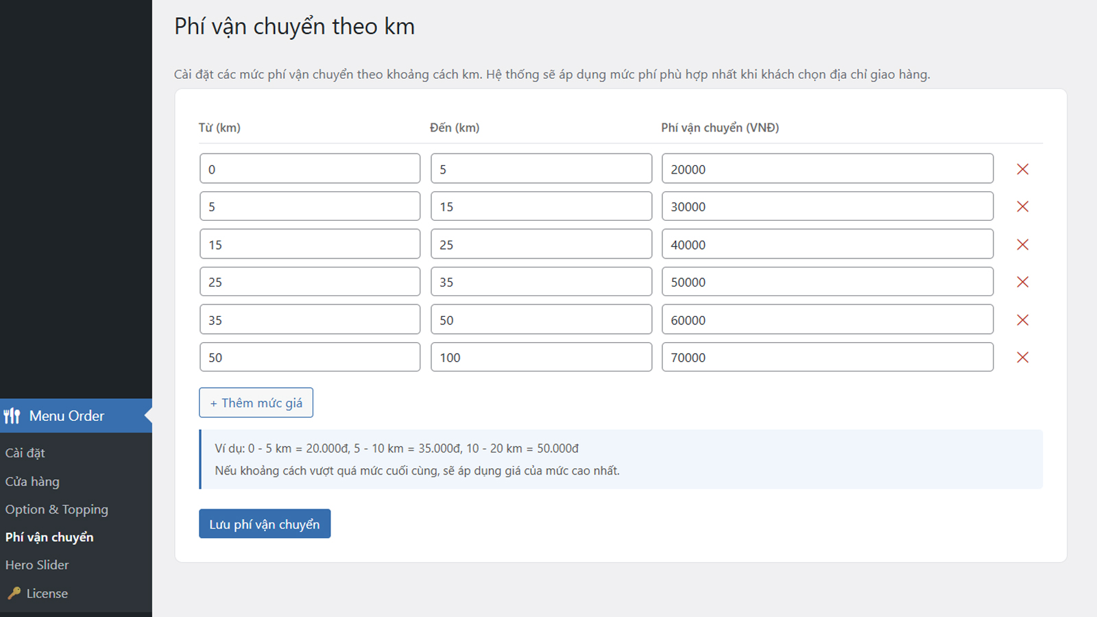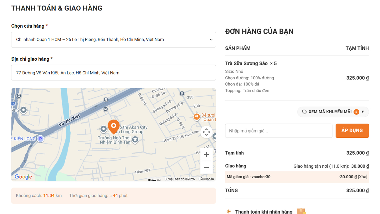 - Lựa chọn cửa hàng -> Chọn địa chỉ giao -> Sẽ tính được khoảng cách giao hàng và thời gian giao hàng. Tính ra chi phí giao hàng do mình setup chi phí giao hàng theo km.
